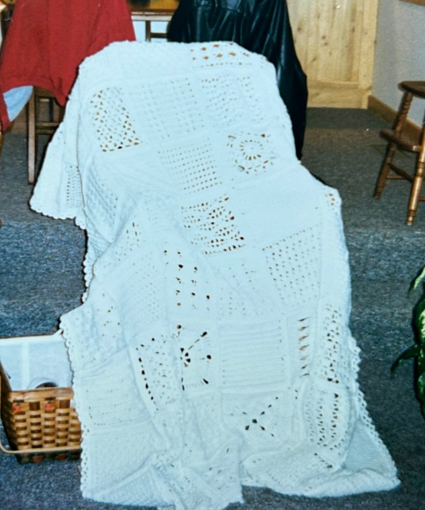 This booklet is more than just a pattern; it includes illustrated stitch descriptions that taught me to read patterns and presented me with the challenge and opportunity to learn 63 new stitches and designs. I completed the blanket and took a couple of photos to remember it by — photos, on film, developed at a pharmacy.
