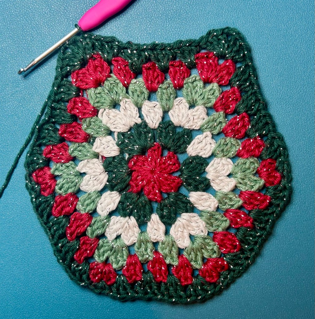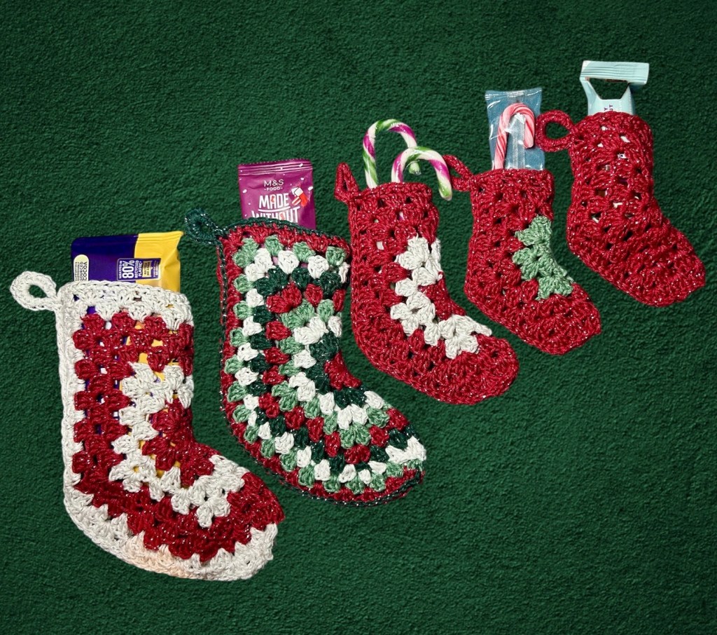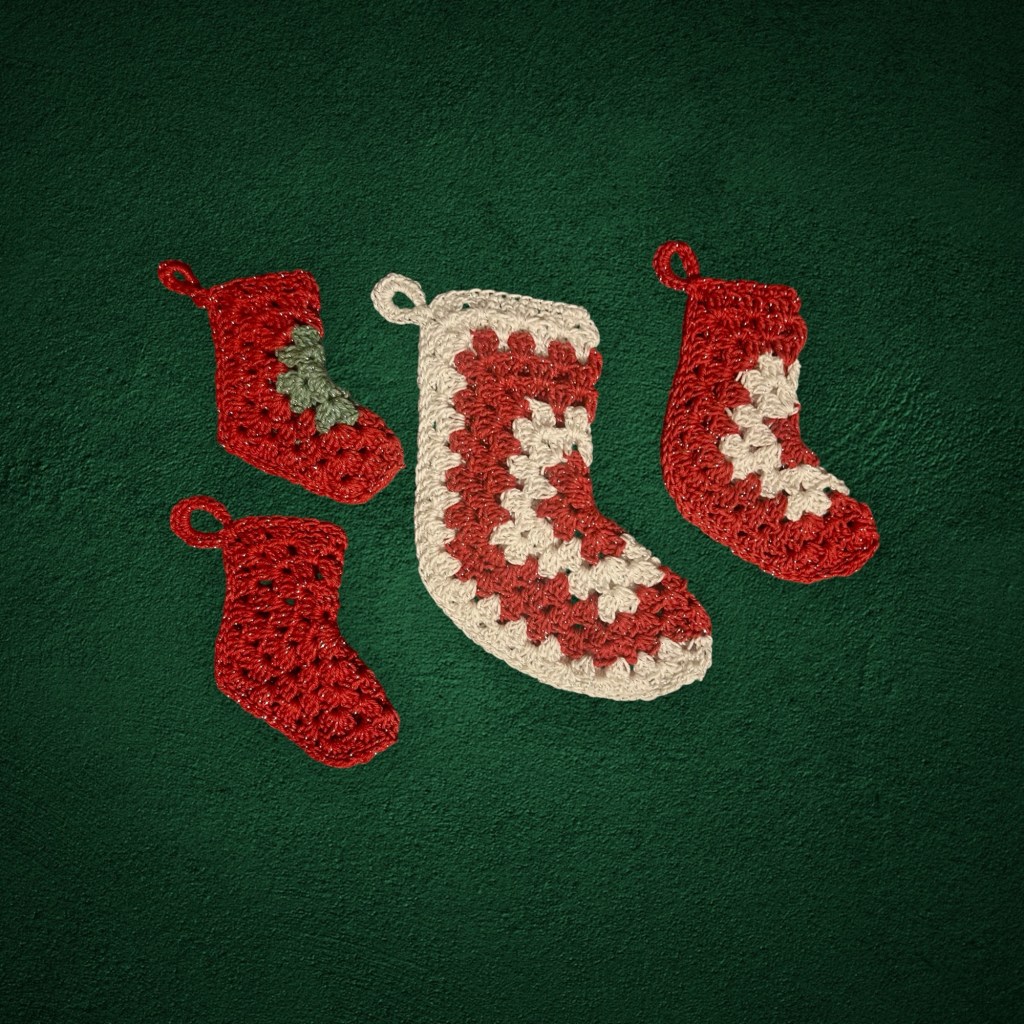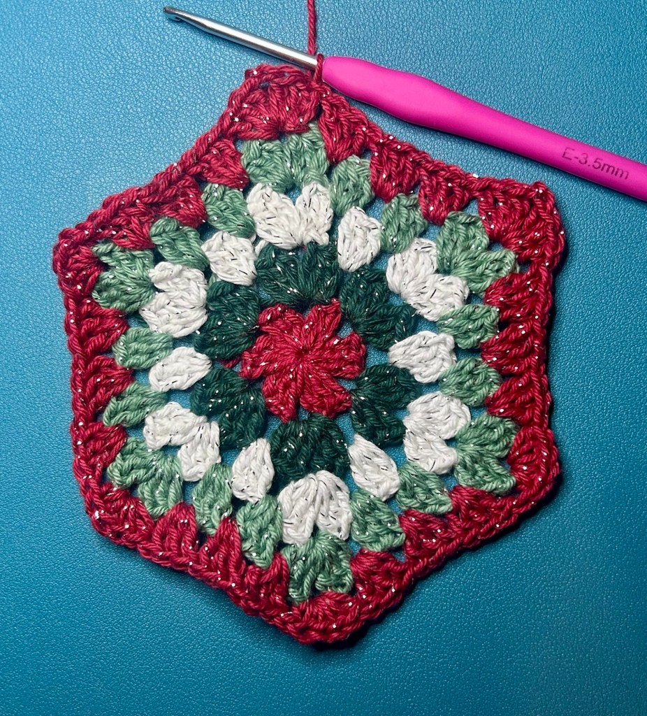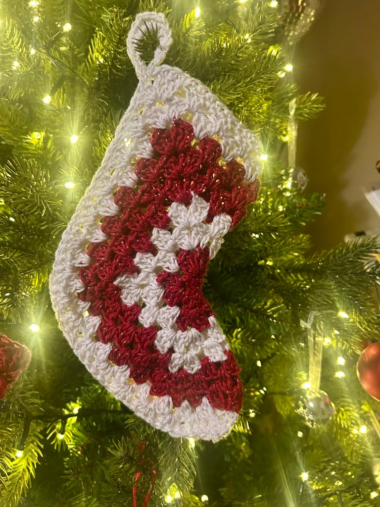 A granny hexagon stocking is an easy, straightforward make. I’ve made them for years in various sizes (which I include variations for below). The small one is just the size for stuffing a few mini-candy canes into. The medium is perfect for regular candy canes or even a narrow chocolate bar, and the large one you can put more sizeable gifts into.