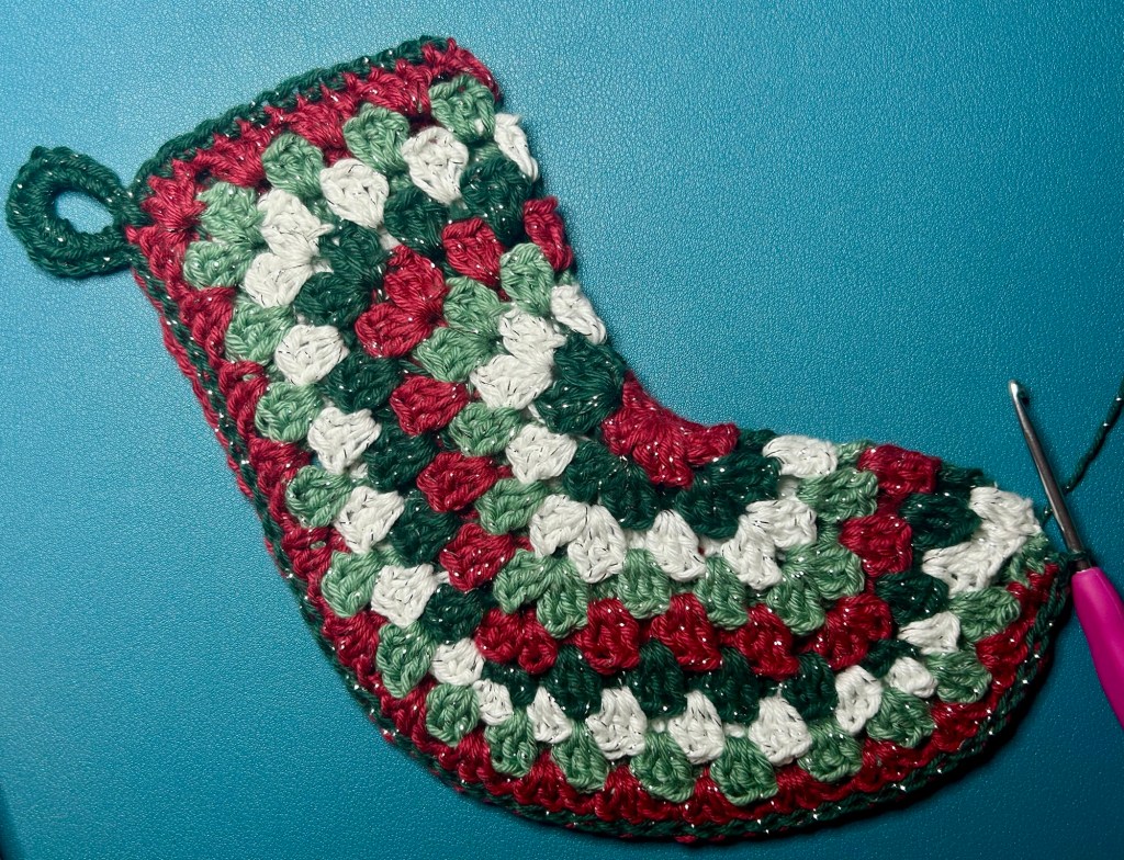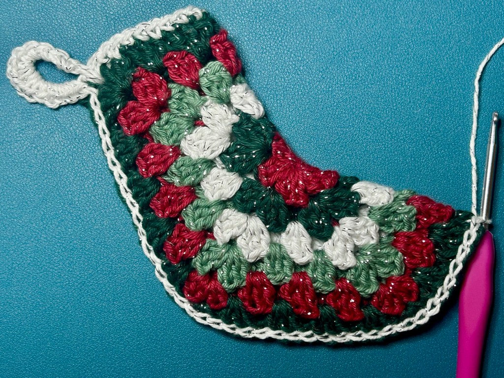 The stocking looks best if you do the finishing round in the same color as the previous round. I use a contrasting color in the photos to make it easier for you to see the finishing round.