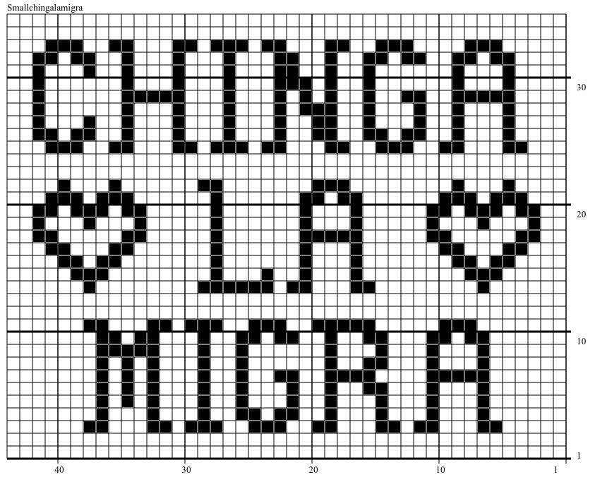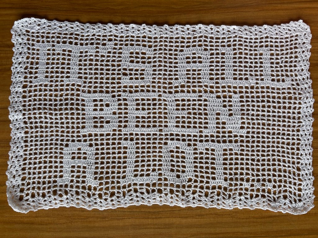 And now, some disclosures: I usually chart my filet crochet patterns out on actual, physical graph paper, but that is when I am just making a pattern for my own use. I don’t know how to transfer a design like that easily from paper to pdf, so to get these out there quickly and in a format that might be broadly readable, I am relying on an app for help. The app is called FCCreator, is very easy to use, and is not horribly costly. You can totally do this yourself! There is an option to turn the graph into written instructions, and I am considering adding those to the graph. As far as I can tell, that process is automated, but not AI. But even if I do rely on the written instructions the app has generated, it will be withmodifications (for example, I tend to work with 10 cotton, but the app only gives measurements for 20 cotton, so I will offer some extra information on which hook size or gauge you can expect with 10 thread as well). For the lettering, I tend to use the models offered in the book Say it in Filet: 6 Thread Crochet Designs by Betty Phipps. I do modify them at times.